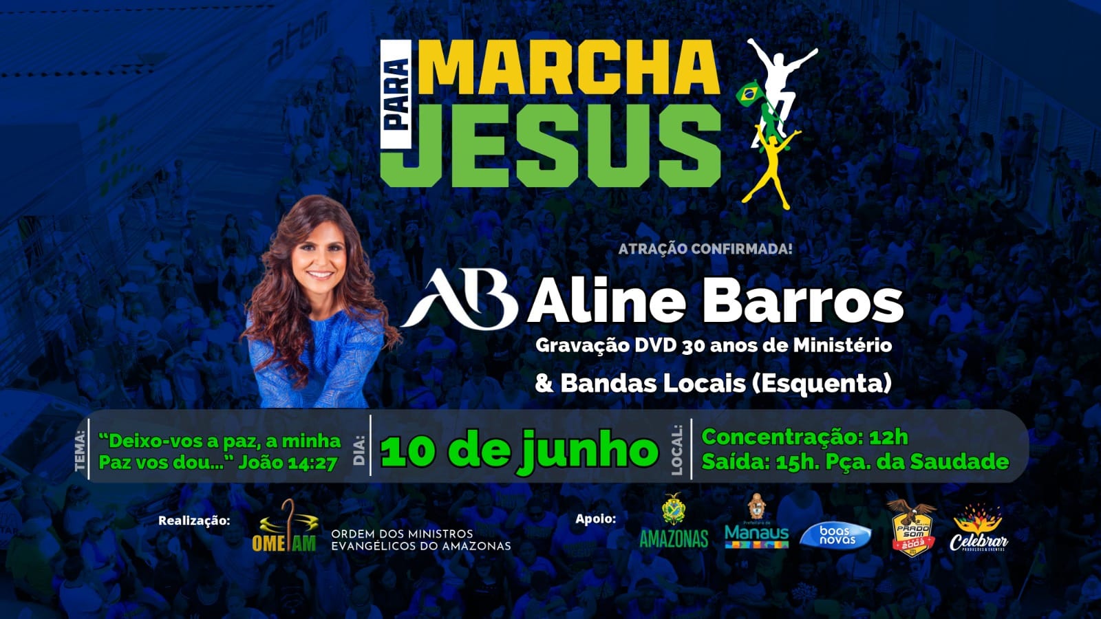 O presidente da Omeam, Valdiberto Rocha, celebra mais uma edição da Marcha para Jesus, e convida todos a participarem. “Quero convidar para a nossa 29ª Marcha para Jesus. Venha conosco, vamos nos concentrar na praça da Saudade às 12h, e, às 15h, estaremos saindo para marchar em direção ao sambódromo, onde nós estaremos celebrando, orando, pedindo a benção de Deus pela nação brasileira, pelo Estado do Amazonas e pela cidade de Manaus, pelas famílias e pela unidade e, no final, nós receberemos a cantora Aline Barros, para celebrar seus 30 anos de ministério”, comentou o presidente.