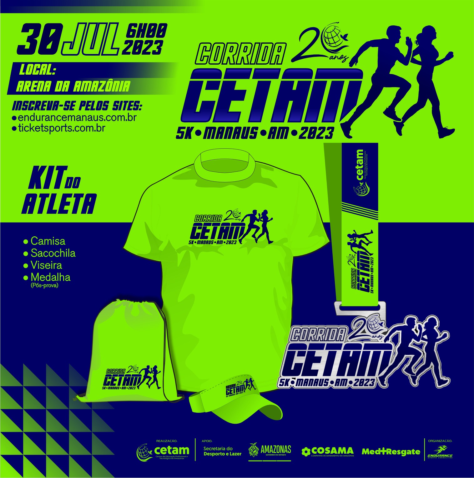O kit do atleta, composto por sacola, camiseta oficial da prova, viseira e número de peito, será entregue na sede do Cetam, localizada na avenida Pedro Teixeira, 2.354 – D. Pedro I, no sábado (29/7), das 10h às 16h.