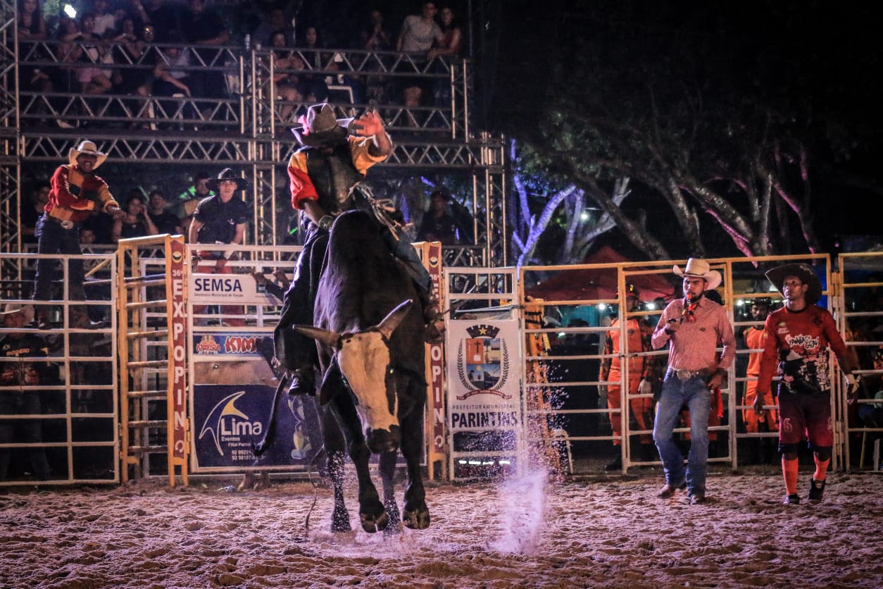 Quinze animais, de no mínimo 800 quilos, entram na arena do rodeio na Pista de Apresentação Osmar Faria, com o público nos camarotes, mesas e arquibancada. A estrutura, com capacidade de até cinco mil pessoas por noite, foi ampliada pelo presidente da Associação dos Pecuaristas de Parintins (APP), Telo Pinto, ao contratar, pelo quarto ano consecutivo, os serviços da companhia de rodeio de Juan Rolon. A 36ª Expopin tem peões de cinco estados: Paraná, Mato Grosso, Roraima, Pará e Amazonas.