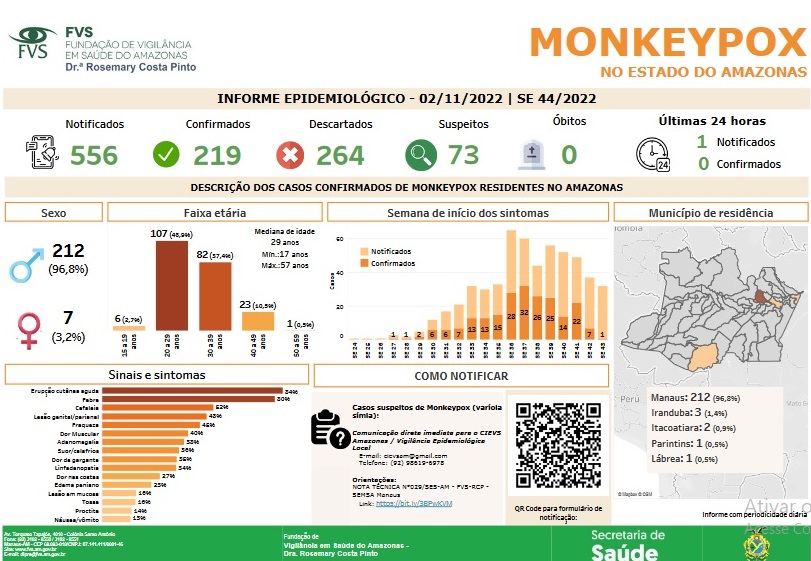 Neste informe, o quadro atual da monkeypox é de 556 notificações, das quais 219 casos confirmados, 264 descartados e 73 suspeitos. Não há registro de óbito pela doença.
