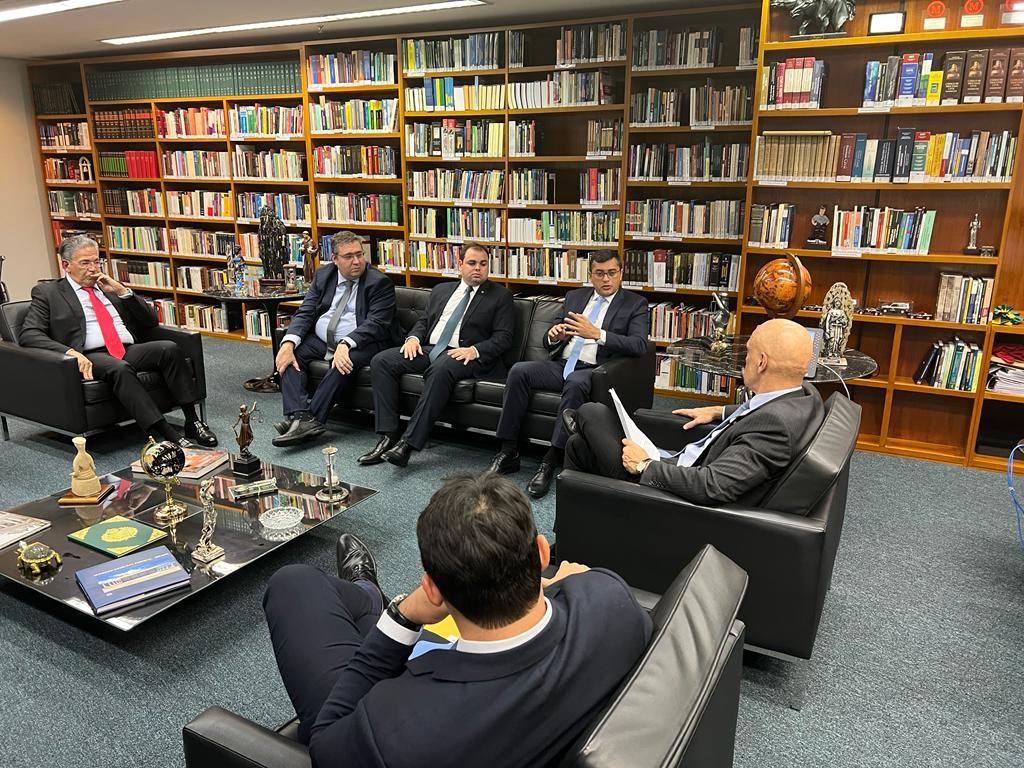 O procurador-geral do Estado, Giordano Bruno Costa da Cruz, o secretário de Estado da Fazenda, Alex Del Giglio, o secretário chefe da Casa Civil, Flávio Antony Filho, o presidente da Assembleia Legislativa do Amazonas (Aleam), deputado Roberto Cidade, e o ministro do Superior Tribunal de Justiça (STF), Mauro Luiz Campbell Marques, acompanharam o governador Wilson Lima na reunião com o ministro Alexandre de Moraes.